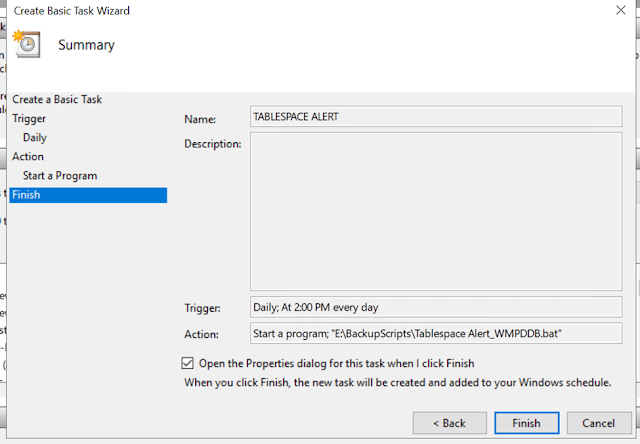 Now lets create the batch script that will be used to monitor the tablespace usage and send an alert if the usage hits a predefined threshold value. In our case we have set threshold value to 80%. This can be modified as per the requirement.
