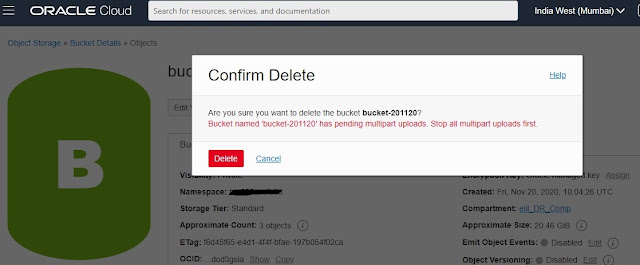 [prodtestdb@ccuine23 ~]$ oci os multipart abort –bucket-name bucket-201120 –object-name online_L0_PRODTEST_156_1 –upload-id 91cad581-82e6-09d5-caf8-a4d4d5fa029a