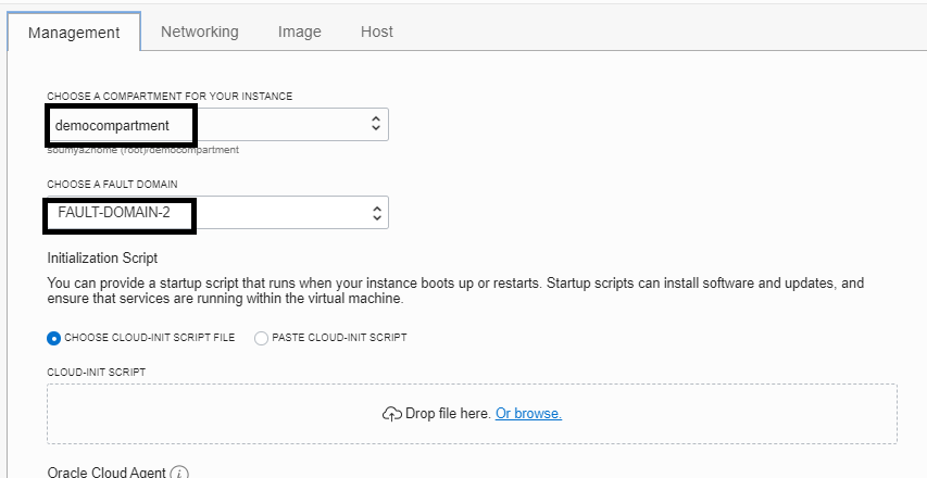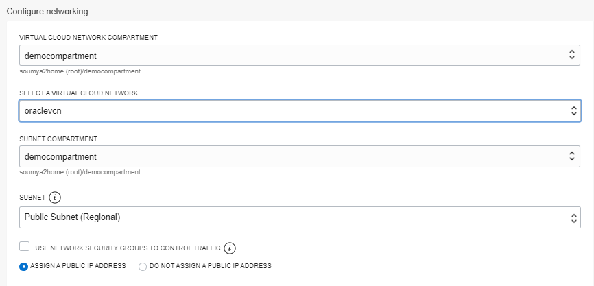 Choose a VCN . A VCN must be created before creating an instance.Also choose compartment for subnet.