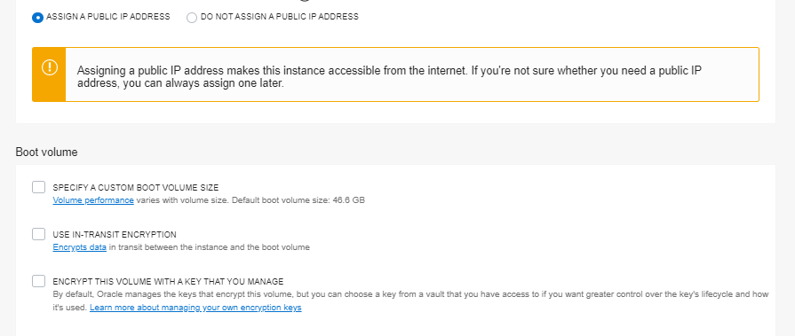 Next select “Assign a PUBLIC IP Address” if you want OCI to assign a Public IP . For boot volume the default size is 46gb but this can be customized ranging from 50GB to 32TB