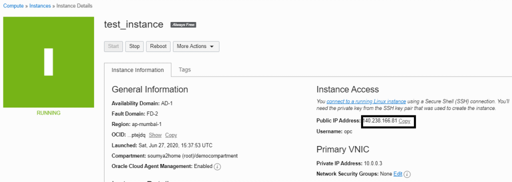 On instance details screen, we can see different details about the instance such as Public IP ,Private IP, Fault Domain etc.