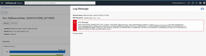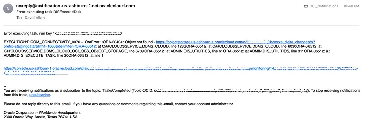 The function will check the result of the task run and post a notification, the email will look something like this containing the error message from the task along with a link to the OCI Console to the task run;