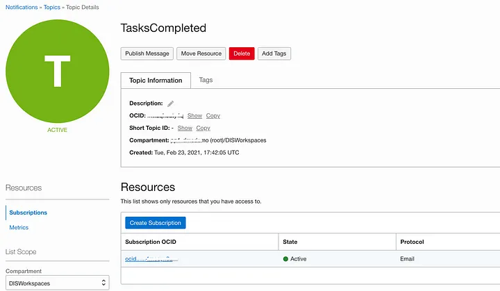 Firstly I have created a topic in the notification service. The topic name is TasksCompleted, I have also created a subscription which uses email — when you add a subscription you will get an email accepting the subscription. You can then test using the “Publish Message” button on the topic panel in OCI Console;
