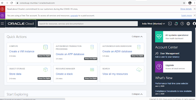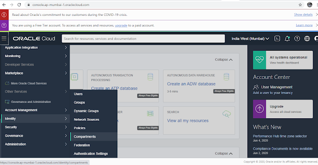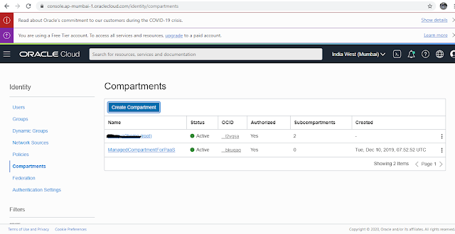 In the compartments screen , we see two compartments created alrady. One of them is the root compartment and another one is The ManagedCompartmentForPaaS compartment, which is an internal compartment used for delivering Oracle PaaS Services within the OCI infrastructure.