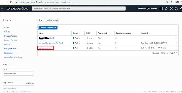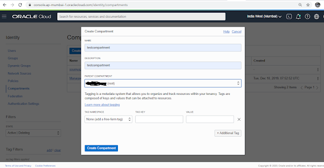 Now, click on “Create Compartment” and provide a name & description for it. By default the compartment gets created under the root compartment . If  you wish to create the compartment under any other compartment you can select here.
