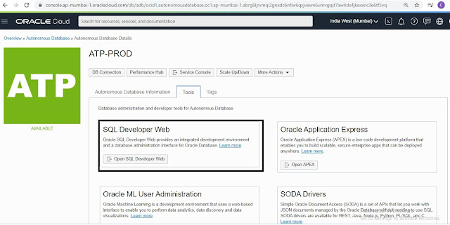 Navigate to Tools, and open SQL Developer Web. We can use SQL Developer which if its available on your local PC. Just make sure the connection towards the ATP-D is working properly. From SQL Developer we would firstly make some changes into the database.