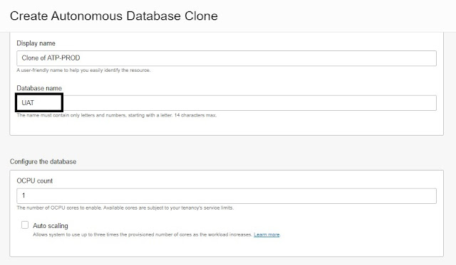 For Database name we choose a name UAT. Note:The cloned refreshable instance name cant be same as source database’s name in same OCI region.