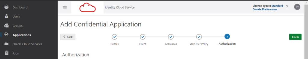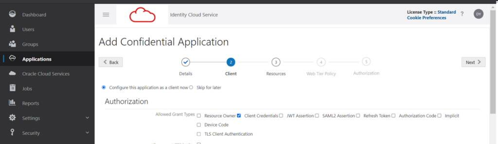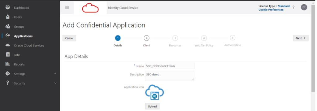2. Open Oracle IDCS and create a confidential application. A confidential application links between parent and child tenancies.