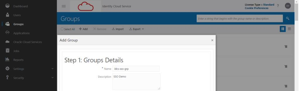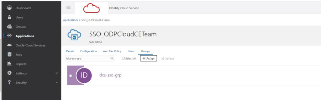 Select the application created earlier (SSO_ODPCloudCETeam). Under the Groups tab, click Assign, add the idcs-sso-grp group, and click OK.