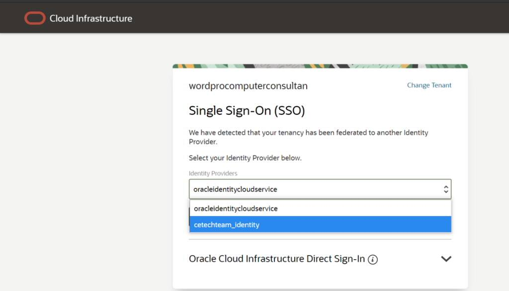 5. Test time! Log in to child tenancy (in our example, wordprocomputerconsultan) and select the new identity provider. Log in with the credentials from the parent tenancy.