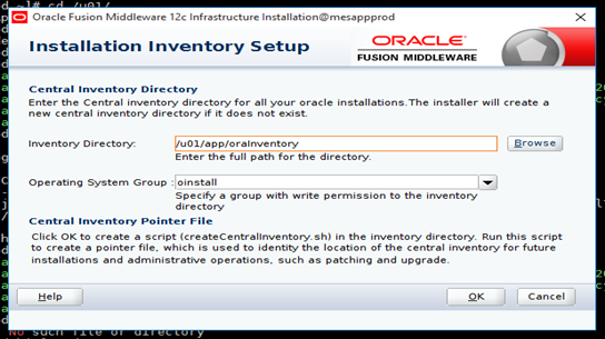 If this is is the first installation on the machine you will need to specify an inventory location. Enter the inventory location, like “/u01/app/oraInventory” and click the “OK” button. In our case we had database installed previously on the same machine hence it didn’t ask for inventory location.
