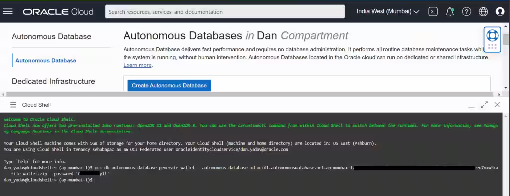 2. Generate the wallet for the autonomous database to connect and run the following command: