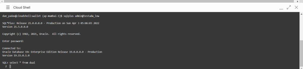 The connection is made successfully to Autonomous Database from Cloud Shell!