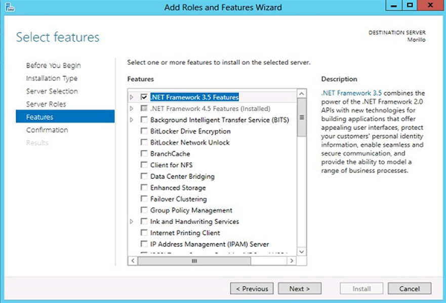 Step 6. On the “Features” page of the Wizard, we clicked on the checkbox next to “.NET Framework 3.5 Features”, and then clicked on the Next button.