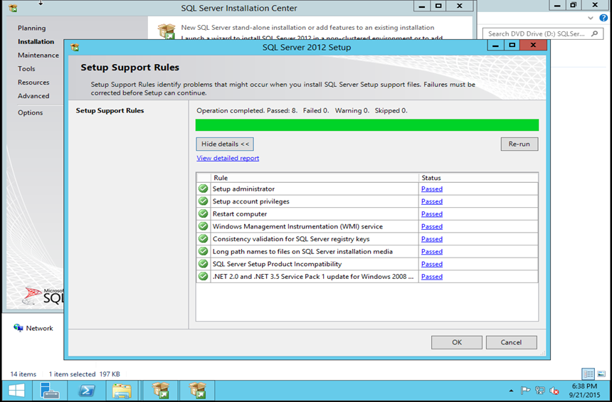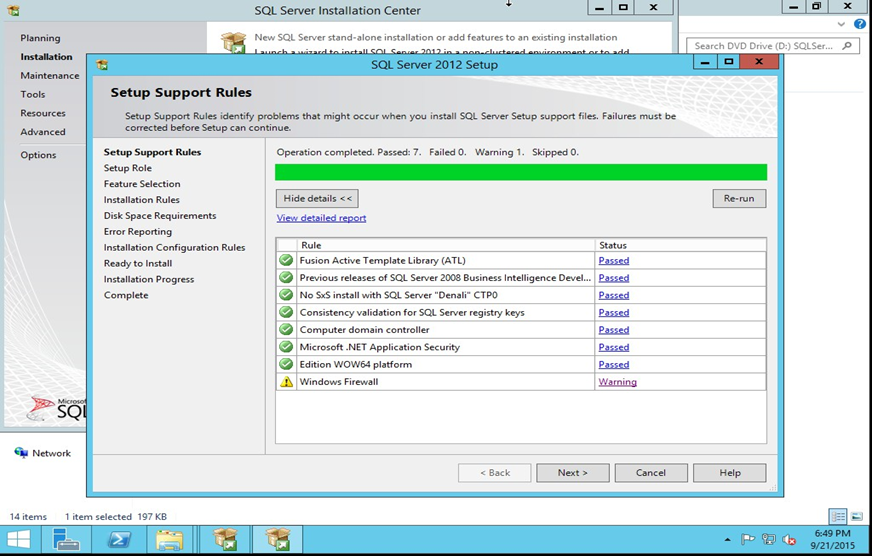 Step 6. Make sure the Pre-install Setup Support Rules provide a Passed Status for each rule or acceptable warning, and then click Next.