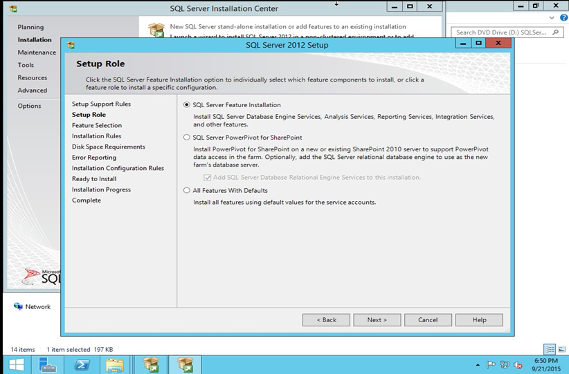 Step 7. DB Server Setup – Do not choose All Features With Defaults, unless you truly to want them ALL. Continue with Feature Installation for a precise Server install.