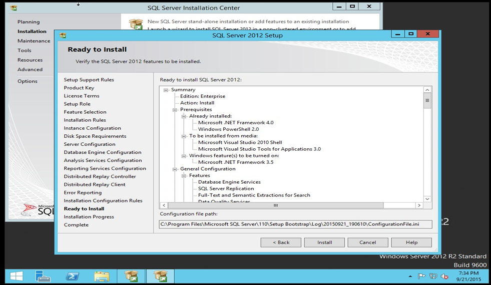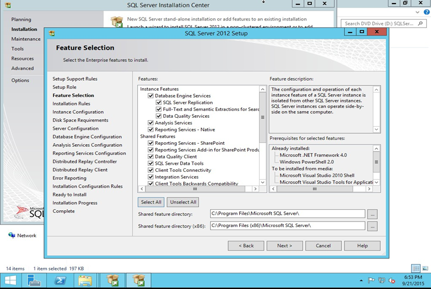 Step 8. This particular instance is for a Server, thus had requirements of DB Engine, Data Quality Services, Analysis Services, Reporting Services. A typical Workstation installation would only require Client Tools Connectivity, **Backwards Compatibility, and Management Tools .