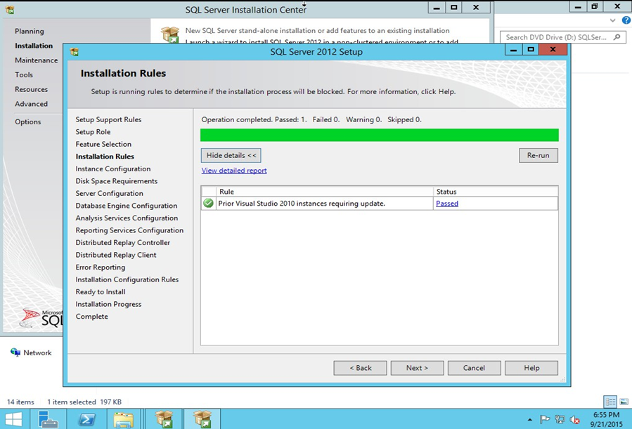 Step 9. A new installation step added since 2008 R2 is this Installation Rule Confirmation for Visual Studio: