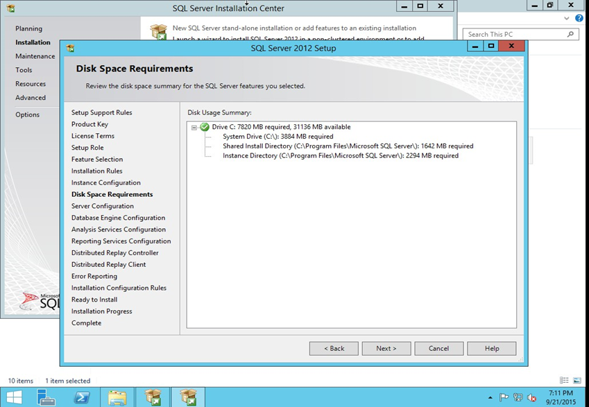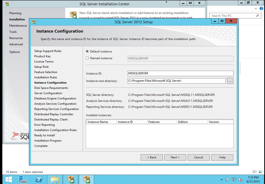 Here, Default instance means you connect to the machine name ,If you want a specific instance name , select named instance -thus the instance name will be Machinename\InstanceName.N.B: On a Server please make sure Instance root is on your dedicated Data Drive (most cases will be D, and not C) Some System Admins prefer to reserve even a disk partition for Applications, thus C for Windows OS, D for applications, as well as reserved drive letters for Data, Logs and TempDB (e.g. E, L, T). You can Click Back at any point to change and validate
