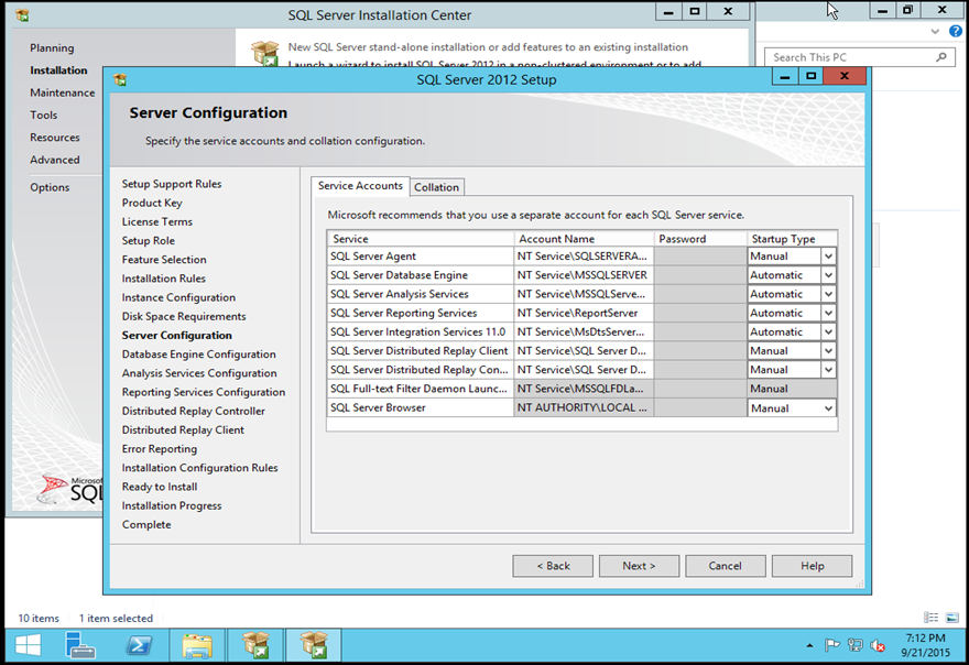 Step 12. a) Server Configuration – Click on Use the Same account for all SQL Server services For a production SQL Server chose a domain account that is reserved for SQL Server (a Service Account specifically, which is preferred by auditors as well as Administrator.).