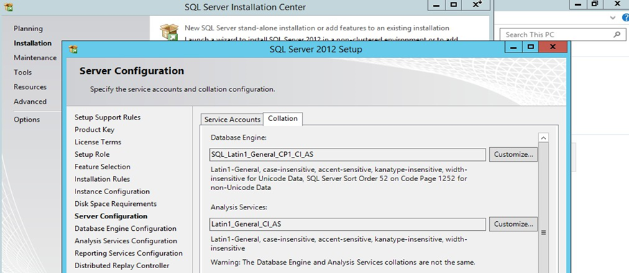 b) Leave the Collation tab as is, SQL_Latin1_General_CP1_CI_AS is the default and is the Latin Character set which accounts for Accent Sensitivity and Case Insensitivity.