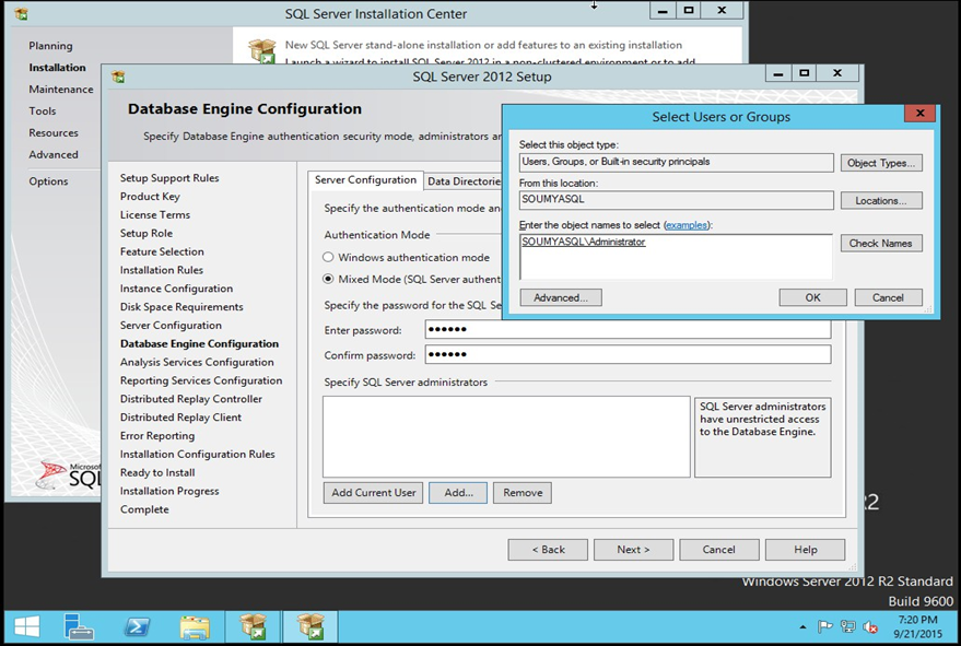 Step 13. a) Select Mixed and provide password for sa user , and Add the group which holds all the DBAs, or in this case, my local machine account with Administrative rights.