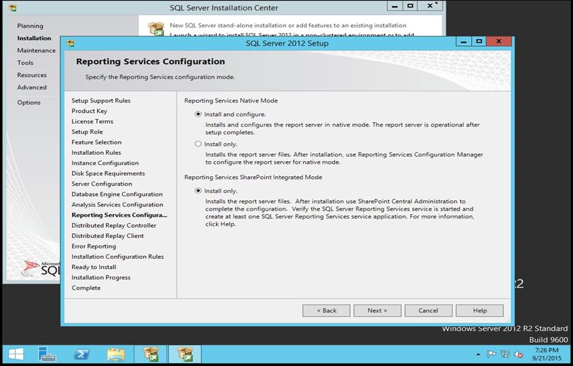 Step 15. For Reporting Services, use Native Mode, since we are not using SharePoint (or leave Install only, and configure RS at a later date.)